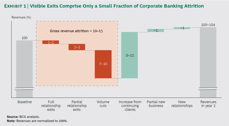 BCG research shows that corporate banks annually lose 10% to 15% of gross revenues to attrition. Stemming even part of this loss could improve bank revenues dramatically—especially since revenue growth across corporate banking segments has hovered in the 0% to 4% range for the past few years.