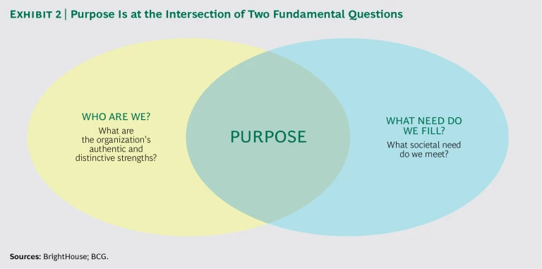 The Essence of Purpose. Unlike mission (the “what”) or vision (the “where”), purpose is the organization’s “why.” It’s at the intersection of two fundamental questions: Who are we? (that is, What are our authentic and distinctive strengths?) and What need do we fulfill in society? (Why do we exist beyond what we make, do, or sell? and Why work for us?). (See Exhibit 2.)