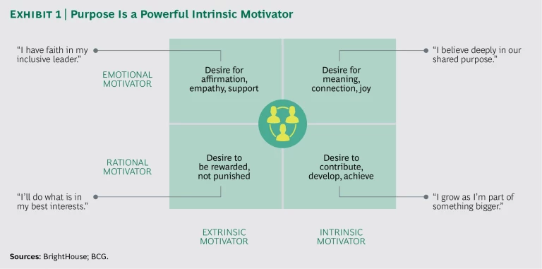 To counter this tendency, organizations are realizing the need to appeal to head and heart with intrinsic, not just extrinsic, motivators. Extrinsic motivators focus on individuals’ desire to be rewarded (rather than punished) and to have their contributions recognized by leaders and peers. Intrinsic motivators include employees’ desire for meaning, connection, and joy in their work, as well as the desire to contribute, develop, and achieve. (See Exhibit 1.) Purpose is one of the most powerful intrinsic motivators because it speaks to both the head (as the compass that guides and aligns behaviors) and the heart.