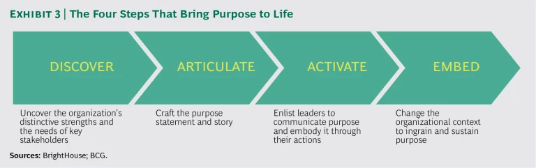 Our approach to developing an authentic purpose and helping organizations live it integrates internal and external inputs from multiple perspectives with four steps—discover, articulate, activate, and embed—that build upon and reinforce one another. (See Exhibit 3. For a description of how a company moved through these steps, see the sidebar “How Purpose Helped One Retailer Rack Up Success.”)