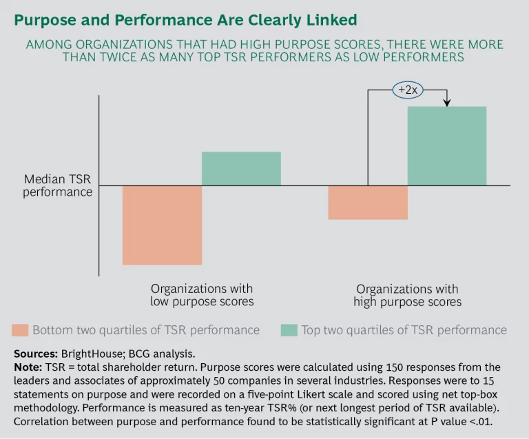 Purpose Pays. First and foremost, studies show that purpose-driven organizations perform better. Our own in-depth analysis of the link between purpose and performance revealed that a deeply ingrained purpose correlates strongly with ten-year total shareholder return. (See “The Purpose-Performance Payoff.”)