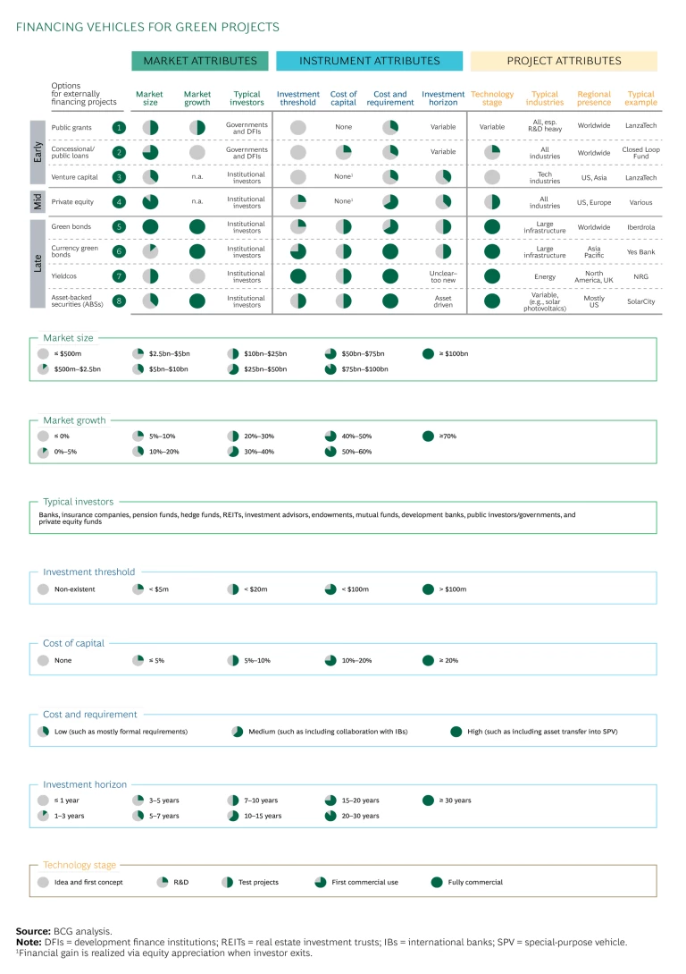 Our resulting report revealed, first and foremost, that green investments must be financially attractive. And in fact, they do deliver above-average returns, as shown in the 13 case studies outlined in the report. Various sources of funding are available for green projects, depending on their stage of maturity. The report explores eight different options ranging from grants and government loans to venture capital and green bonds. The overview of each option includes typical market, instrument, and project attributes. (See the exhibit.) For instance, we found that the green finance market for venture capital is $5 billion to $10 billion, largely funded by institutional investors and primarily focused on early-stage projects in technology industries.