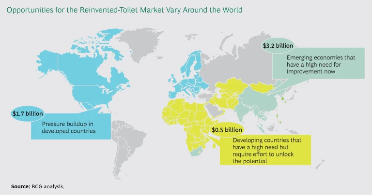 The new sanitation technologies can be deployed in both developing and developed countries, and the size of the opportunity varies depending on the setting. In developed countries that are building on current sanitation infrastructure, a potential market exists of about $1.7 billion annually. Meanwhile, emerging economies with high needs, market readiness, and national policies prioritizing improvements in sanitation offer a $3.2 billion opportunity, even taking into account lower price points. (See the exhibit.)