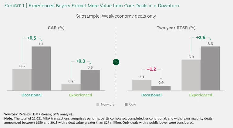 Although the strategic concept is sound, occasional buyers often fail to create much value from such core deals. (See Exhibit 1.) In a weak economy, investors initially favor core deals. For occasional buyers, the CAR around the announcement date of core deals exceeds that of noncore deals by 0.5 percentage points, while for experienced buyers the CAR differential is 0.3 percentage points. In analyzing value creation after two years, however, it appears that occasional buyers fail to meet investors’ expectations. For occasional buyers, the two-year RTSR of core deals is 1.2 percentage points lower than that of noncore deals. But for experienced buyers, the RTSR of core deals is 2.6 percentage points higher than that of noncore deals.