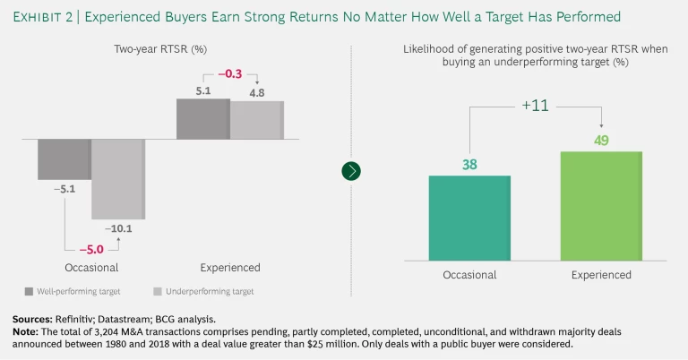 Companies that have superior operational capabilities are better equipped to withstand cost pressure in a downturn. Best-in-class companies have an advantage in M&A as well, because they can apply their capabilities to create tremendous value at poorly performing targets. But does M&A experience make a difference? To investigate, we used EBITDA margin as a proxy for a company’s performance relative to its industry. (We excluded the financial, insurance, and real estate industries from the analysis.) We found that, during a downturn, occasional buyers create less value when they acquire an underperforming target than when they acquire well-performing targets. (See Exhibit 2.) For experienced acquirers, however, the difference between acquisitions of underperforming targets and acquisitions of well-performing targets is insignificant—they earn strong returns regardless of how well the target performed. These findings also hold true when we adjust the returns for associated risk, as measured by the standard deviation of the two-year RTSR. Clearly, experienced buyers possess capabilities that allow them to extract greater value from underperforming targets.