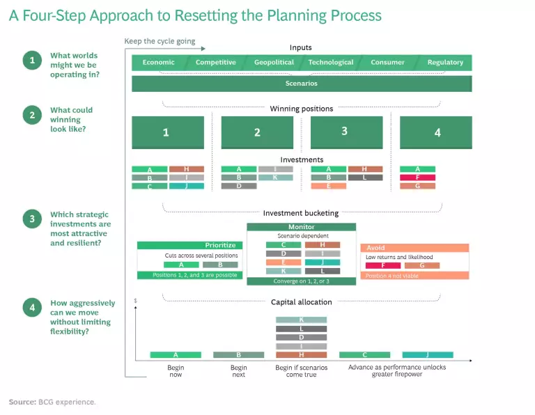 In addition, investors are offering management unprecedented flexibility. Approximately 90% of institutional investors told BCG that they support companies’ efforts to build strategic capabilities even at the expense of EPS, and about two-thirds say they are on board with management sacrificing current margins to gain future advantage. Given that, the question is not whether to plan, but how to do so in a way that maximizes both ambition and flexibility.