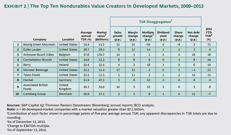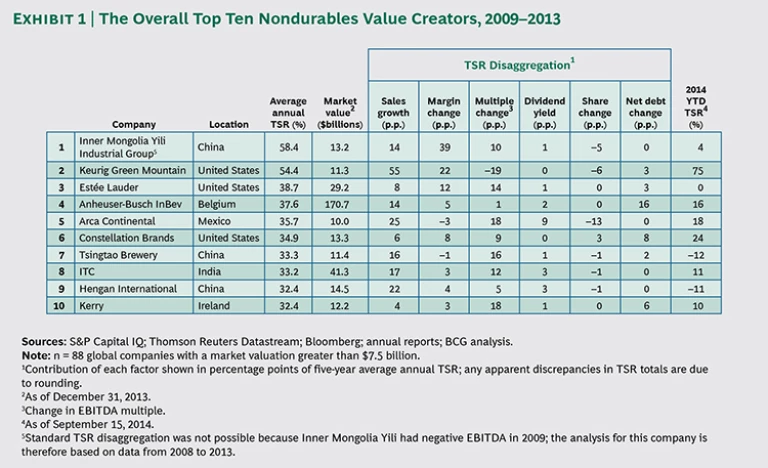 In 2014, as in past years, The Boston Consulting Group conducted an annual study of total shareholder return among 1,620 publicly traded companies in 26 industry sectors, of which 88 were in the nondurables