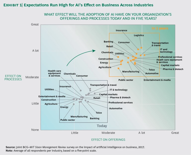 The high expectations for AI cross geographies, industries, and companies, regardless of size. While most executives have not yet seen substantial effects from AI on their offerings and processes, they clearly expect to in the next five years. (See Exhibit 1.) Most organizations foresee sizable effects on IT, operations and manufacturing, supply chain management, and customer-facing activities. Business-process-outsourcing companies, for example, expect many of the jobs that moved to low-labor-cost countries in recent years to be automated. However, they also expect AI to lead to new activities and sources of employment. Executives at industrial companies expect the largest effect in operations and manufacturing. In connection with its new A350 program, for example, Airbus is using AI to speed and improve production. The company has combined data from past production programs, continuing input from the A350 program, fuzzy matching, and a self-learning algorithm to identify patterns in production problems. In some areas, the system matches about 70% of seemingly unrelated production disruptions to solutions used previously—in near-real time.