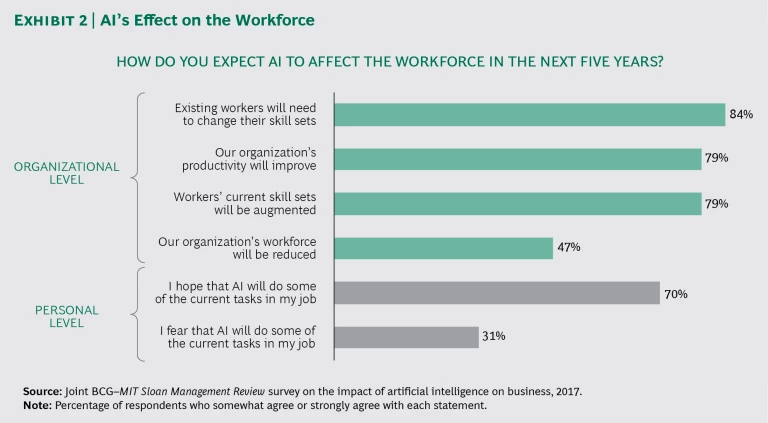 Contrary to recent dire predictions about AI’s effect on employment, our survey suggests cautious optimism. Most respondents, for example, do not expect that AI will lead to a reduction of jobs at their organization within the next five years. (See Exhibit 2.) Nearly 70% also said they are not fearful that AI will automate their own jobs. By a similar margin, respondents hope that AI will take over some of their more boring and unpleasant current tasks. However, respondents overwhelmingly agree that AI will both require employees to learn new skills within the next five years and augment their existing skills.