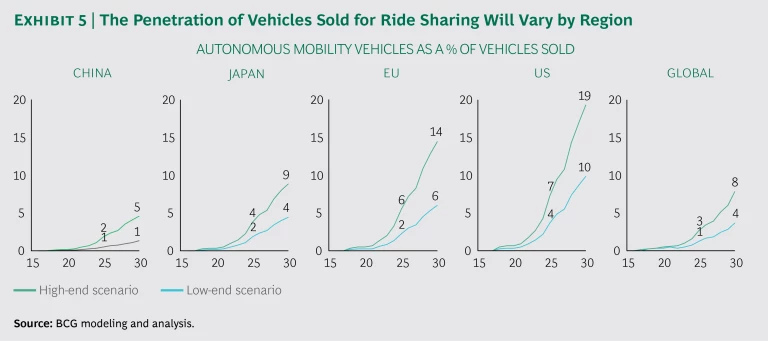 Our current research indicates that ride-sharing adoption rates by 2030 will be highest in large and very large cities (populations of more than 1 million), where they are likely to range from 40% to 80%. We also expect ride-sharing penetration to be significant—20% to 40%—in the metropolitan areas immediately surrounding city centers. Uptake will vary by region, with the heaviest usage likely in the US (a range of 10% to 19%) and Europe (6% to 14%). (See Exhibit 5.) Because all of these shared cars will be electrified by 2030—with the majority of them fully electric owing to the fast payback possible by that time—shared mobility will significantly boost the proportion of new-vehicle sales claimed by electrified vehicles.