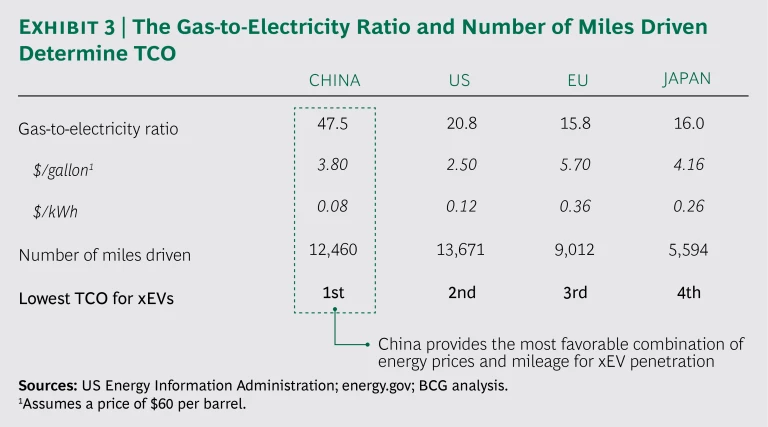 The adoption curve for EVs varies to some extent by market depending on the TCO, which reflects several factors. These include the price of the vehicle, the number of miles driven, and gas and electricity costs. (See Exhibit 3.)