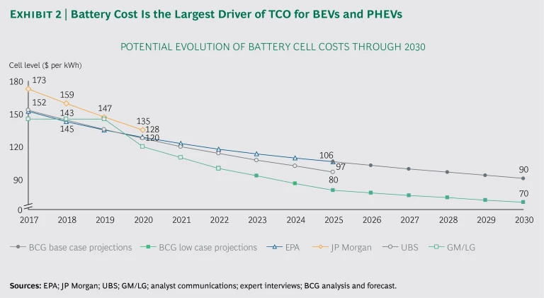 At the same time, battery costs, which are the single largest driver of TCO for BEVs and PHEVs, are declining further and faster than projected just a few years ago. They have dropped from about $700 per kilowatt-hour (kWh) in 2009 to about $150 to $175 per kWh today at the cell level. BCG forecasts that batteries’ cost per kWh will fall to $80 to $105 by 2025 and from there to between $70 and $90 by 2030. (See Exhibit 2.)