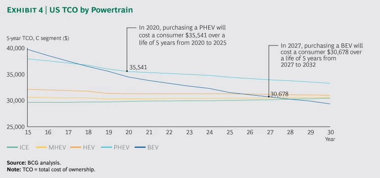 In China—which is the leading market for EVs so far—high mileage, low electricity costs, and high gas prices already combine to give these vehicles a favorable TCO relative to ICE-powered cars and trucks. Thanks to the Chinese government’s incentives, the consumer’s TCO for BEVs reached a five-year payback in 2015. Not surprisingly, China has the highest number of xEV sales of any major market. Even so, xEV penetration is only 3% there currently, and we expect only modest increases until about 2025. At that point, xEVs’ share will approach 20% and begin to accelerate more rapidly. By 2030, China will be the largest single market for BEVs, which will have a 17% share of auto sales; hybrids will take another 28%.