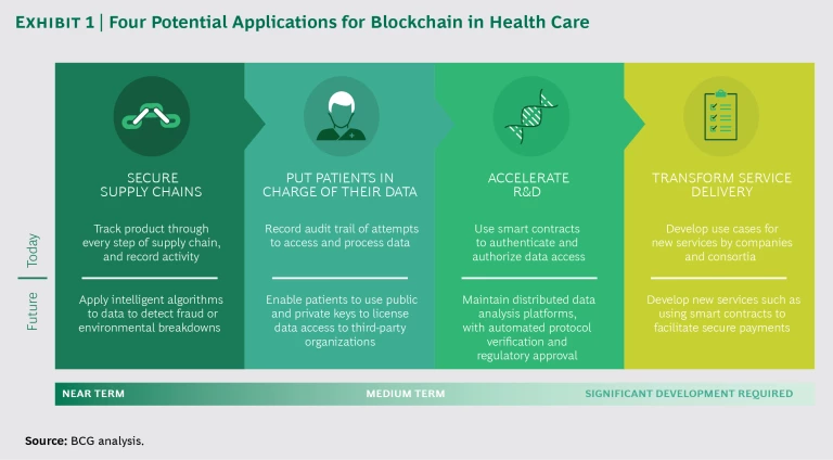 The same attributes that enable secure, validated, anonymous, and efficient financial transactions with cryptocurrencies—and disintermediate such middlemen as banks and brokers—can be applied to transactions in other data-intensive, highly regulated, and inefficient industries such as health care. All health care applications today are still in early stages of development and proof of concept—but let’s consider four promising health-care-related scenarios. (See Exhibit 1.)