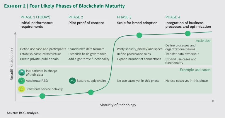 Blockchain will not disrupt health care overnight—or even over the next few years. Various aspects of funding, technology and talent, governance, and collaboration need to develop further before we reach a tipping point in adoption and impact. Even so, lots of players are aggressively pursuing solutions. As blockchain technology overcomes hurdles and continues to mature—moving from establishing initial performance requirements to building a pilot proof of concept to scaling up successful models, and ultimately to integrating those models into business processes—we expect adoption to increase. (See Exhibit 2.)