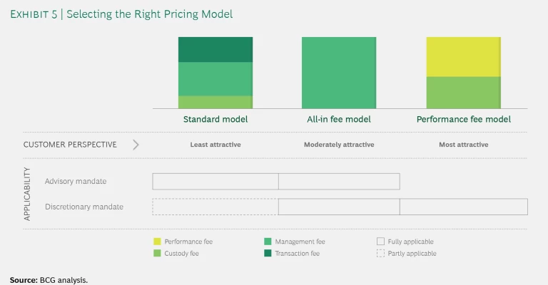 There is widespread movement in the banking industry toward value-based fee models, in which banks charge either an all-in advisory/discretionary portfolio management (DPM) fee—sometimes a single fee that reflects the client’s choice ­between advisory and DPM—or a performance-based fee. (See Exhibit 5.) Clients generally appreciate these structures.