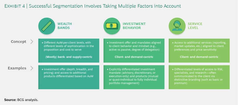 By improving their understanding of clients’ investment attitudes, firms can gain valuable insights for designing personalized propositions at different price points that are likely to straddle wealth bands. Smartly deployed, these can enable a much more effective allocation of resources. In parallel, management firms may adjust the time that RMs spend with different clients to ensure that the time they invest matches the firm’s and each client’s needs. (See Exhibit 4.)