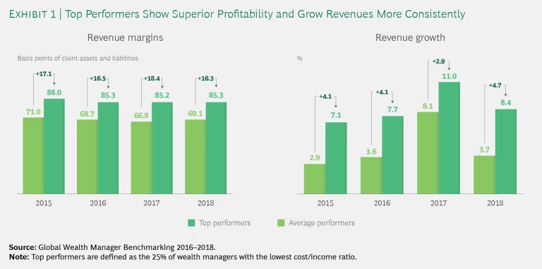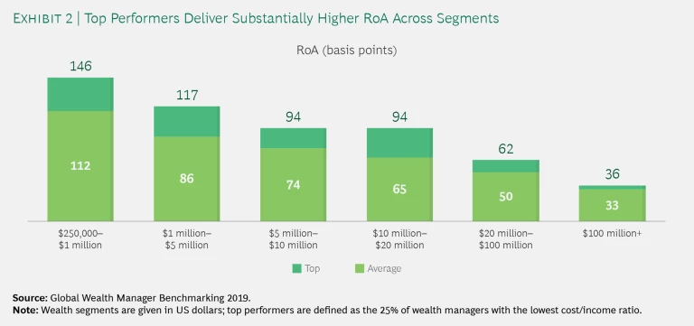 In 2018, the ­return on assets of the top quartile was 85 basis points, compared with an industry average of 69 basis points, according to BCG Global Wealth Manager Benchmarking of 150 institutions. This tendency was consistent across wealth bands. (See Exhibit 2.) The group posted a pretax profit that was almost twice as much as the average amount (34 bps compared with 18 bps), and it grew revenues 5 percentage points faster. Individual relationship managers (RMs) also outperformed the pack, earning 25% to 30% more than the average RM.