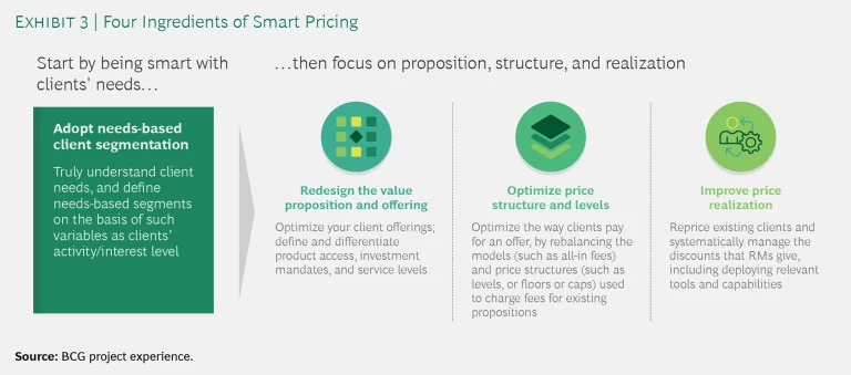 The first step is to invest in understanding individual clients better. In the modern era of tailored experiences, standardized experiences are no longer adequate. Firms must invest in advanced data and analytics and in comprehensive evaluation to better understand clients’ actual needs and pain points. A consciously differentiated proposition and a simple menu of advisory mandates are important accompaniments to better segmentation. Another a key element is price realization, which ­involves thinking carefully about how RMs approach their interactions and what training they need. (See Exhibit 3.)