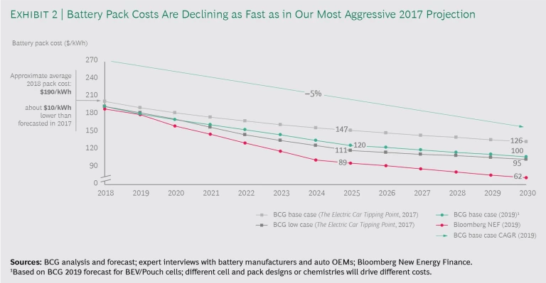 Falling TCO. By far, the biggest cause of falling TCO for BEVs is battery prices, which are decreasing more steeply and more quickly than expected. On the basis of extensive discussions with battery manufacturers and experts around the world—notably in China and South Korea—as well as with car manufacturers about their expectations as they work out their battery purchase plans, we now expect battery pack costs to fall below $100 per kilowatt hour (kWh) by 2030 (as opposed to about $126 per kWh in our previous projection). (See Exhibit 2.) Much of this drop will occur in the next few years, boosting TCO benefits for consumers and accelerating EV market uptake. The speed of the decrease is quite remarkable. Over the course of 15 years, between 2014 and 2030, battery pack prices will have slid more than 80%, from $540 to $100. Some market observers and OEMs, including VW and Tesla, are predicting an even faster decline.