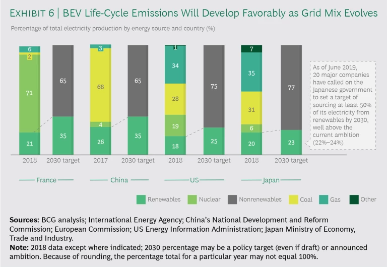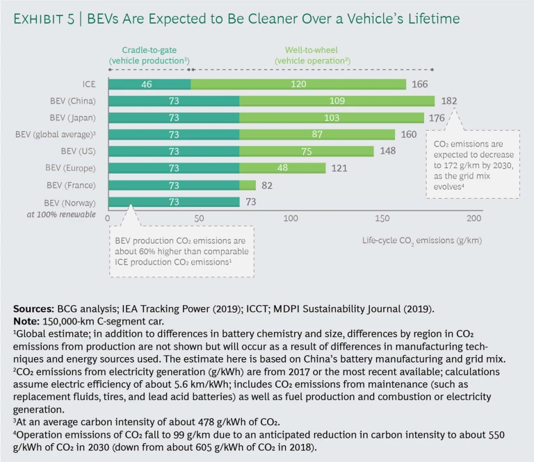 The life-cycle emissions advantage of an EV thus depends on the vehicle’s location, with the regional energy mix being the main driver of CO2 emissions. (See Exhibit 5.)