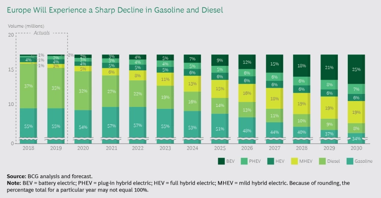 Here’s good news for consumers, the auto industry, and potentially the planet—an unusual trifecta. BCG’s latest global automotive powertrain forecast shows sales of electrified vehicles (xEVs) growing even faster than expected. These cars will seize a third of the market by 2025 and 51% by 2030, surpassing sales of vehicles powered purely by internal combustion engines (ICEs). Our previous forecast, completed in 2017, showed xEV sales taking a quarter of the market by 2025 and approaching 50% by 2030. Battery-powered electric vehicles (BEVs) and plug-in hybrids (PHEVs) will seize almost a quarter of the market by 2030; we had previously projected their global market share at about a fifth.