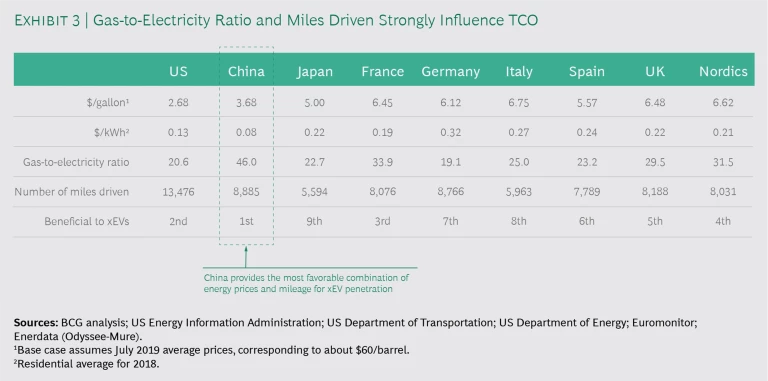 Although consumers will still need incentives to support BEV sales during the next two to three years, once the car is purchased, electricity is cheaper—often much cheaper—than gasoline, by the kilometer or mile. Take the US, where both gas and electricity are cheap and distances far. Our previous research showed TCO for a medium-size, C-segment car in the US market reaching a five-year tipping point for BEVs in about 2027. (In addition to being influenced by purchase price and maintenance costs, TCO is a function of the number of miles driven, gas or electricity costs, and residual value. See Exhibit 3.) We now believe that the TCO tipping point for the same vehicle will come in 2022 at a five-year cost of $32,950. The five-year TCO for BEVs will then fall steadily from there to less than $29,150 in 2030, giving drivers a real financial incentive to go electric.