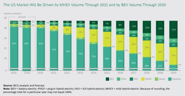 Many OEMs will lean on MHEV sales over the next several years, since the technology offers the cheapest way to improve the efficiency of ICEs and meet CO2 regulatory standards—up to a point. As a result, sales will grow as much as 40% a year. The fast ride will slow by about 2025, however, as the falling price of batteries enables BEVs to take share.