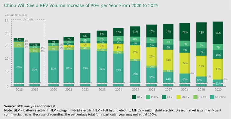 Battery-powered electric vehicles (BEVs) and plug-in hybrids (PHEVs) will seize almost a quarter of the market by 2030.