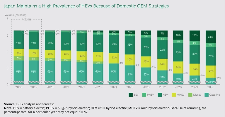 The Japanese market will develop according to its own dynamics. There, HEVs already have a 22% share and will be difficult to dislodge, as OEMs have made substantial investments in a dominant “middle ground” technology that meets emissions standards and consumer needs. Growth in BEVs (to 13% by 2030) and MHEVs will come primary at the expense of traditional ICEs. HEVs are likely to hold their own as a combination of low yearly mileage and a lot of urban driving makes hybrid drivetrains an adequate technology for the country.