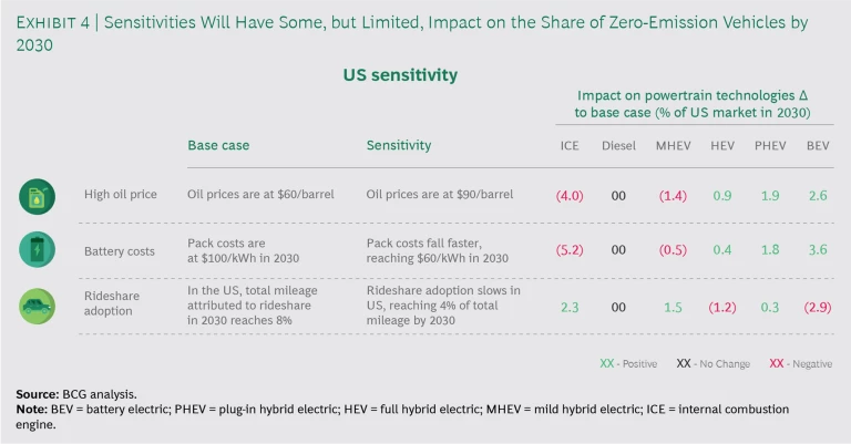 Moreover, our projections show relatively little sensitivity to variables such as the price of oil. Our base case assumes that oil will remain at the $60-a-barrel level. If it were to jump to $90 (and stay there), we project that traditional ICEs in the US would lose an additional 4 percentage points of share while BEVs would gain 2.6 points—not insignificant numbers in a big market, but not game-changing either. (See Exhibit 4.) Likewise, a further decrease in battery costs from $100 per kWh to $60 per kWh would increase the share of BEVs in 2030 by 3.6 percentage points.