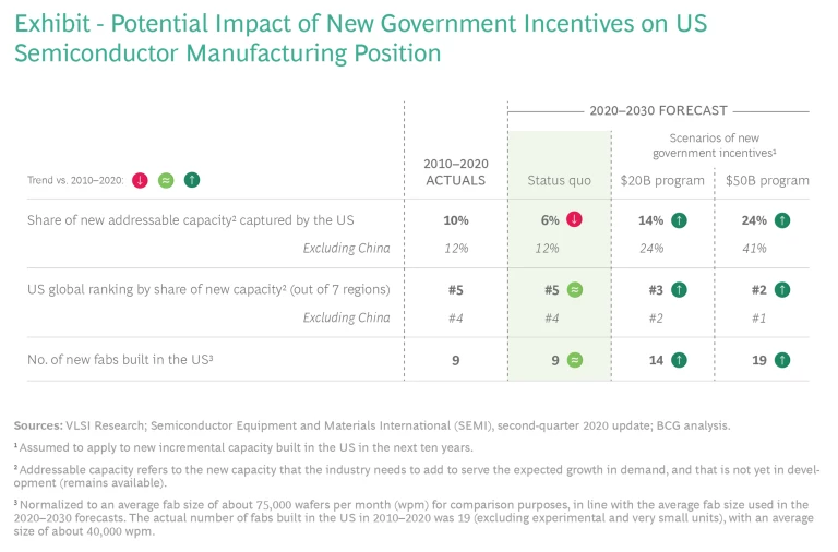 Global manufacturing capacity is forecasted to increase by more than 50% from 2020 to 2030, presenting a market opportunity for the US to attract a higher share of the new future fabs. According to our analysis, a $20 billion to $50 billion federal-government program of additional grants and tax incentives for new state-of-the-art fabs built in the next decade would be effective in reversing the last 30 years’ declining trend in US semiconductor manufacturing.