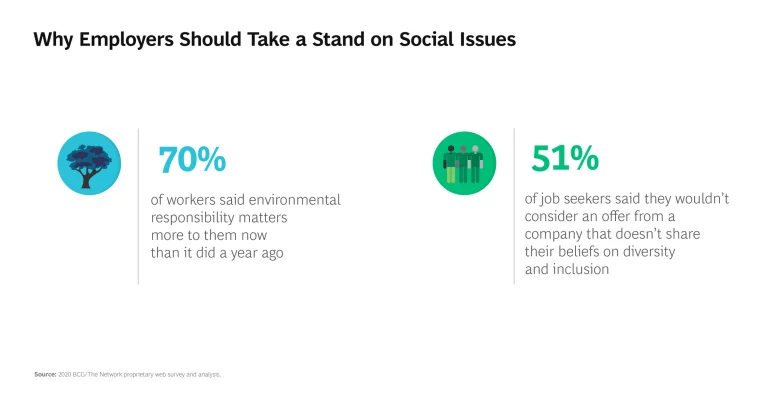 Other developments, besides COVID-19, have also changed people’s work expectations. For instance, the Black Lives Matter protests and the #MeToo movement have prompted job seekers to pay more attention to social values in the workplace. And a succession of climate catastrophes, including the Australian bushfires of 2019 and 2020, have spurred some job seekers to question employers’ levels of environmental commitment. Organizations that respond to these concerns will have a huge advantage as the competition for talent picks back up after the pandemic.