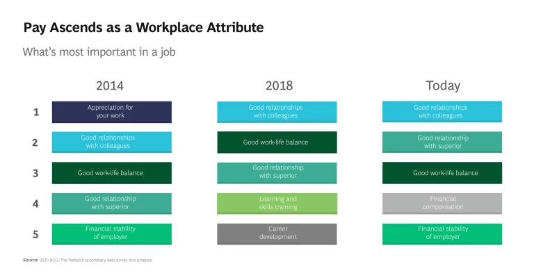 Flexibility regarding work location is only one of the attributes that has become more important to workers during the pandemic. Financial compensation is another. This is not a surprise given the economic and existential threats that people have faced in the past year. Financial compensation is especially important to respondents in China, Poland, and Russia and trails only good workplace relationships and a good work-life balance as a global priority. These softer attributes have been constants in all of the studies that BCG and The Network have done since 2014.