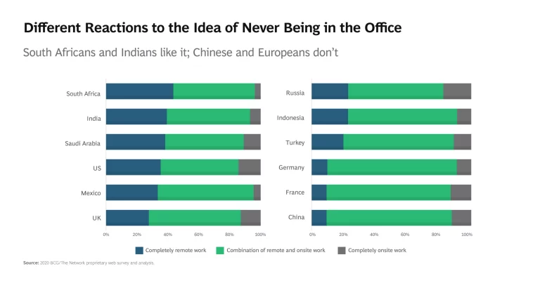 It is indeed flexibility that most workers are interested in, not a wholesale rejection of the traditional model of full-time physical collocation with colleagues. Only a relatively small proportion of workers—one in four—would switch to a completely remote work model if they could. People in developing countries tend to be above the average in favoring full-time work-from-home models; 44% of South Africans and 39% of Indians said they like the idea. Those in developed countries tend to be less interested, though the US is an exception: 35% of its people said they would gladly work from home on a full-time basis.