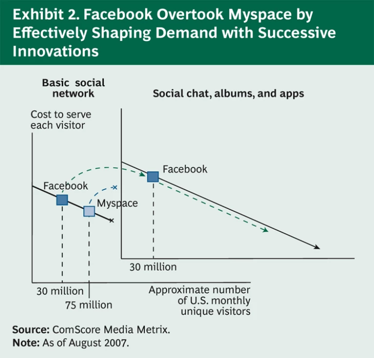 Facebook successfully shaped demand for its services by continually improving users’ experience and doing so faster than rival Myspace. (See Exhibit 2.) To build demand-shaping experience, Facebook released new software weekly and experimented with new technologies and features such as live chat, photo albums, and a third-party app-developer interface. These efforts allowed Facebook to gain a more thorough understanding of users’ needs and desires and respond to them with accelerated new-product generation, translating into a swelling userbase and eventually also an improved cost position.