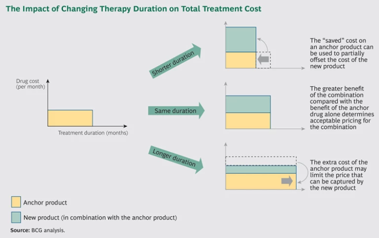 Those differences in the length of treatment have major implications for pricing. (See the exhibit below.) Increasingly, payers are evaluating value and cost of treatments in terms of the total period required for treatment—the “episode of care.” If the episode of care is shorter with a combination than with the single anchor drug, the maker of the second, additive drug is in a strong position in terms of pricing: the cost savings generated by reduced use of the anchor drug can essentially pay for some of the cost and, in certain cases, the full cost of the second drug. In some instances, the total cost of treatment may actually be lower for the combination, thanks to that reduced treatment period.