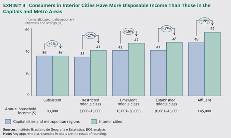 What’s more, interior-city consumers have more disposable income than their counterparts in bigger cities. Around 57 percent of annual household income among the affluent in interior cities is devoted to discretionary expenses and savings, compared with 48 percent in capitals and metro areas. In other words, interior affluent households have 19 percent more discretionary income. Established middle-class households in the interior have around 17 percent more discretionary income. (See Exhibit 4.)