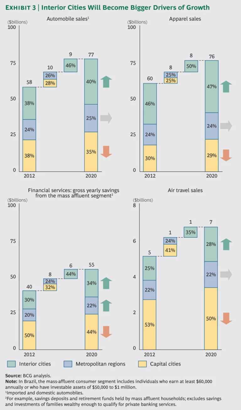Apparel. Around half of incremental spending on apparel in Brazil until 2020 will happen in interior cities, generating annual revenues of around $28 billion. Middle-class and affluent households in the interior spend nearly $1,100 a year on apparel, around 20 percent more than their counterparts in capitals and metro areas.