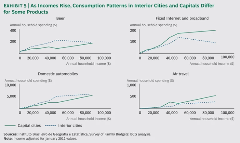 Our research has also found that purchasing patterns of interior households differ from those in capitals. We analyzed consumption curves, which track purchases of certain products as household incomes rise, for more than 200 product categories in Brazil. In capitals, for example, average households tend to increase their spending on automobiles at a steady pace as they become more affluent. Among interior-city households, spending on automobiles increases more drastically when their incomes surpass $20,000 a year and plateaus as their annual incomes approach $50,000. Likewise, spending on fixed-Internet and broadband service by capital city households jumps dramatically when incomes reach $20,000. In the interior, average household spending on Internet services declines moderately after incomes reach $50,000. (See Exhibit 5.)