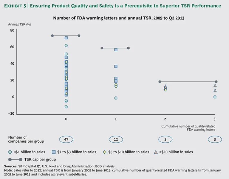 Focus on quality management as a must-have for superior value creation. Finally, medtech companies must continue to focus on developing and producing quality products, in some cases through upgrades to their organization and processes. This is not an operational driver of TSR—rather, quality is a requirement that companies must meet. Recent incidents have caused patients and investors to think of product quality as a negative selection criterion, and companies that have received warning letters from regulatory agencies have a markedly lower TSR performance; clearly companies incur a risk discount for every warning letter they receive. (See Exhibit 5.) The bottom line is that quality issues affect medtech brands among payers, providers, patients, and investors alike.