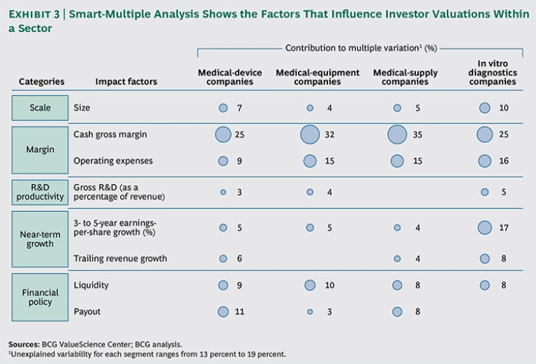 Given the importance of valuation multiples—that is, investor expectations—in driving TSR, we also sought to identify the major drivers behind those multiples. To that end, we applied BCG’s proprietary smart-multiple methodology, which explains roughly 80 percent of the variation in valuation multiples for a given medtech segment and provides critical insights for companies seeking to improve their value-creation