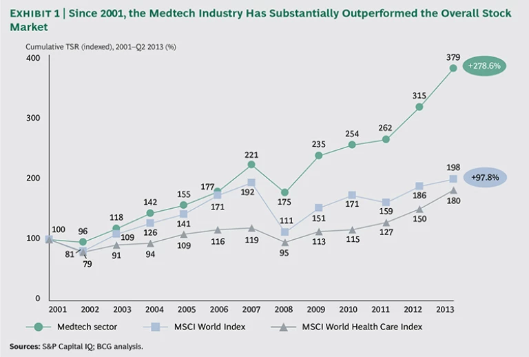 For more than a decade, the medical technology (medtech) sector has outperformed the overall capital market in terms of financial performance. It has generated a total shareholder return (TSR) of 279 percent since 2001, substantially beating the MSCI World Index, which returned 98 percent over the