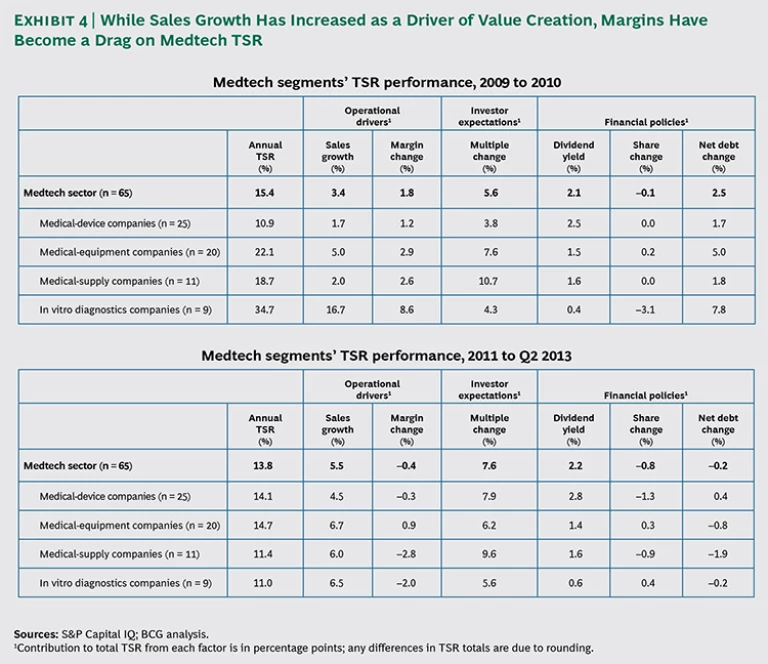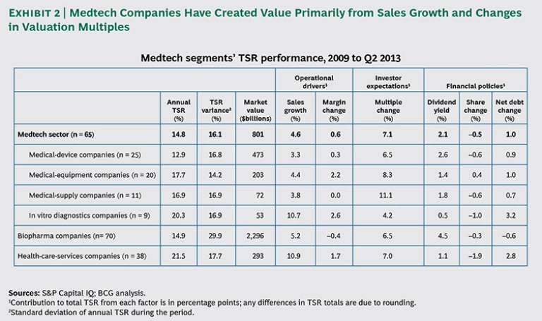 For each of these segments of the medtech sector, we looked at the key drivers of value creation from 2009 through the second quarter of 2013. Drivers included those related to operational measures (sales growth and margin change), investor expectations (change in valuation multiples), and financial policies (dividend yield, change in the number of shares, and change in net debt). (See Exhibit 2.)