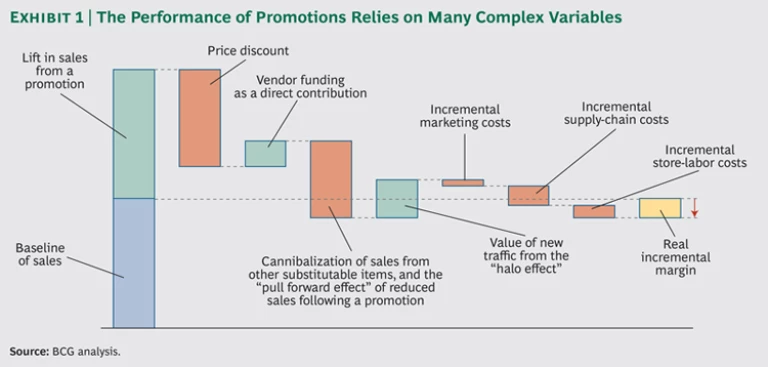 Understanding the performance of promotions is difficult, because the necessary analysis is complex and because processes are interdependent. As a first step, retailers need to establish an accurate baseline of sales without promotions to understand the direct lift from a promotion and the cost of the discount. Retailers also need to tease out the secondary effects of promotions. Cannibalization can result when the promoted item reduces sales of other, substitutable items. A “halo effect” can result from the sale of additional products when shoppers come in for the discounted product. And the “pull forward effect” can depress item and category sales following a promotion, since consumers have already stocked up on the products. (See Exhibit 1.)