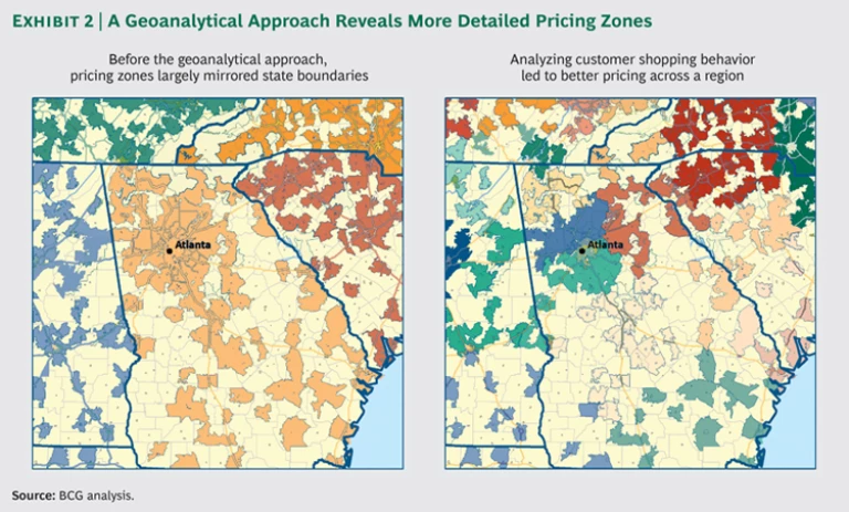 Consider the case of a national retailer that used state boundaries to establish one set of prices across most of the Greater Atlanta area for a group of products essential to drawing customers to stores. An analysis of loyalty card data revealed considerable complexity in customers’ shopping patterns across Georgia and adjacent states. Even within Atlanta, the retailer discovered a wide diversity of customer demographics and shopping behaviors. For instance, because of Atlanta’s sprawl and difficult commutes, stores serving the same cluster of customers tended to be located along commuting corridors.