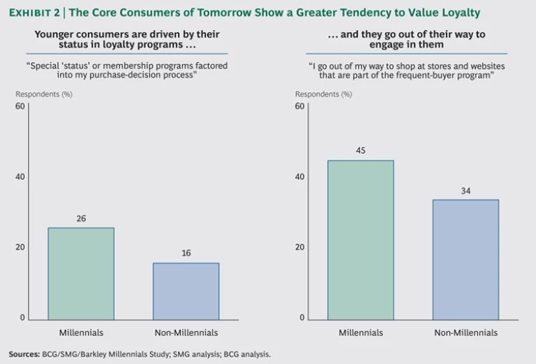 Even more important, Millennials expect a two-way, mutual relationship with companies and their brands. Through the feedback that they express both off-line and online, Millennials influence the purchases of other customers and potential customers. They also help define the brand itself. Millennials are much more likely to factor their special status or membership in a loyalty program into their purchase decisions and to go out of their way to shop at stores and websites where they are members of frequent-buyer programs. (See Exhibit 2.)