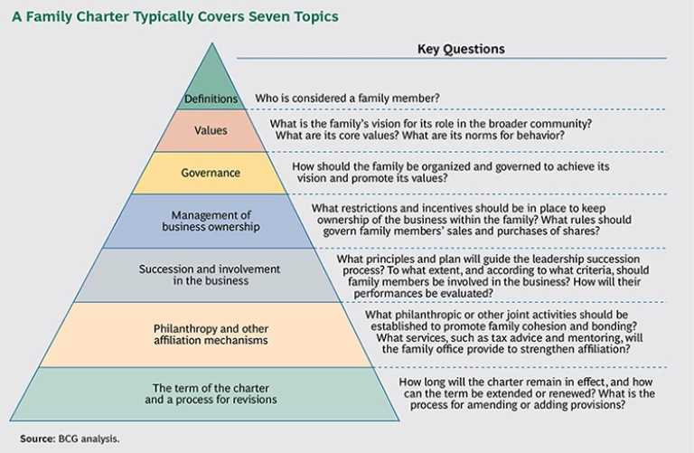 Governance. To successfully manage the transitions described above, as well as daily decision making, a family needs agile governance and clear management structures that are supported by a simple, yet robust, platform of processes and systems. (See “Governance for Family Businesses: Sustaining the “Magic” for Generations to Come,” BCG article, October 2014.) The family charter should outline the system of governance bodies—including the board of directors, family council, family assembly, family foundation, and their supplementary committees—for the family business or philanthropic activities, taking care to specify each body’s roles, responsibilities, and membership, and how the bodies will interact.