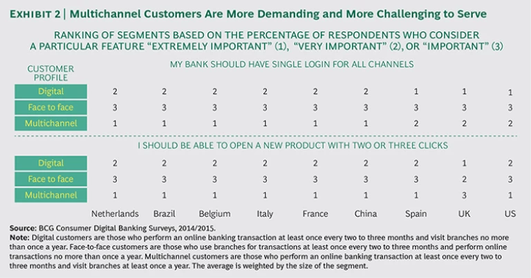 Our findings also showed conclusively that multichannel customers have higher expectations than single-channel customers and therefore are more challenging to serve. (See Exhibit 2.) They demand that their banks be simpler, quicker, more integrated, and more personal. Banks that get their offering right for this demanding group are more likely to get it right for the rest of their customer base.