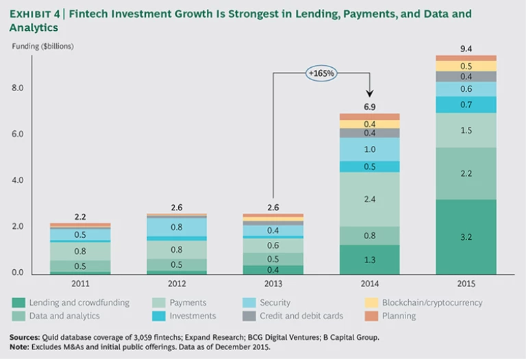 Often, fintechs provide superior customer service as a means of taking market share, rebasing prices, and stealing margin from banks. For example, peer-to-peer lending has grown by more than 150% since 2010, typically filling a gap for consumers or small businesses seeking small finance when traditional options are either not suitable or not available.